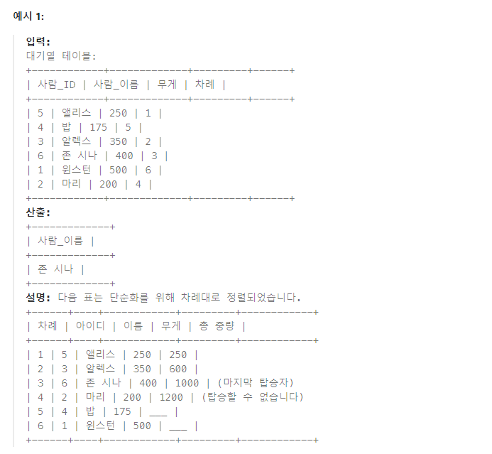 - SUM(Weight) OVER(ORDER BY Turn)을 통해서 누적 합 계산