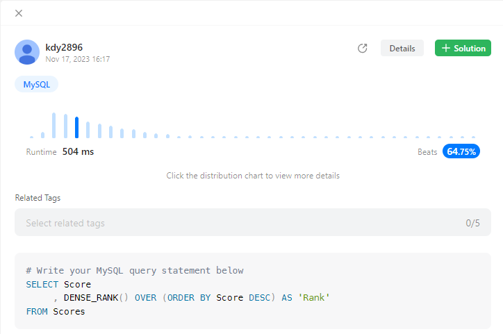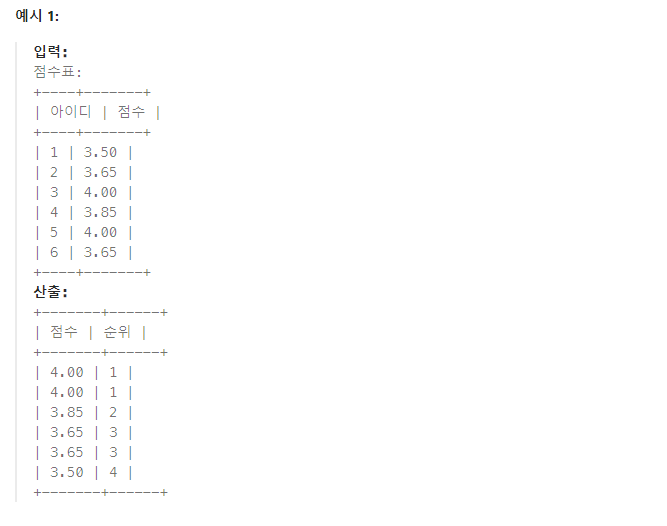 이 문제는 DENSE_RANK를 사용하면 되는 간단한 문제였음 + AS 이후 'Rank'처럼 따옴표를 사용해주는 것이 포인트